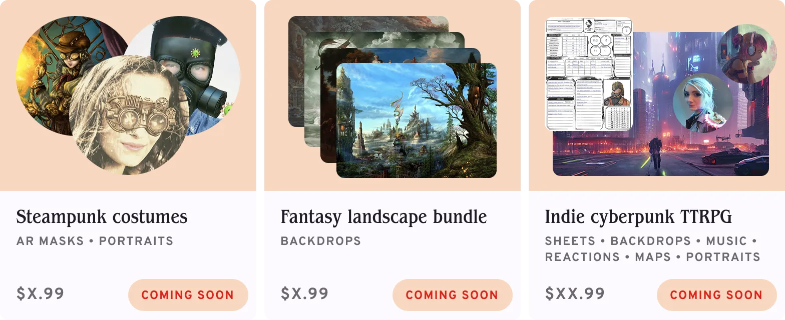 We’re building a Creator Marketplace where users can support creatives in the TTRPG community by buying asset packs of new backdrops, masks, sheet templates, and more. Creators can simply send us their files and we’ll publish them in a way users can install with the click of a button.